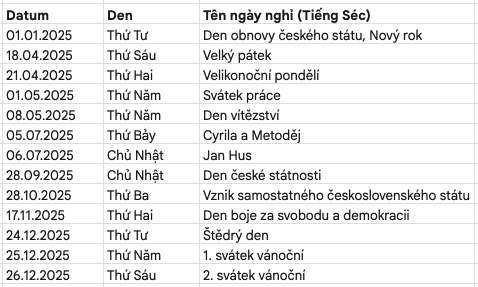 Trung tâm sẽ đóng cửa theo luật lao động của nước Cộng hoà Séc những ngày sau: